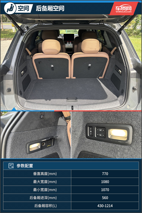 根据官方数据显示,评测车后备厢常规容积为430L,第三排座椅放倒后,整体容积可扩展至1214L,并提供了下沉空间,带来了灵活的储物能力。功能性方面,后备厢内设有挂钩、220V五孔插座,并支持第三排座椅电动放倒,方便快捷,可满足全家多场景使用需求。