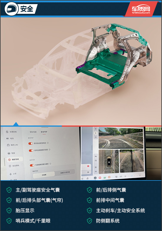 安全配置方面,评测车搭载了丰富的主/被动安全配置。诸如主/副驾驶座安全气囊、前/后排头部气囊(气帘)、前排中间气囊、哨兵模式/千里眼等在评测车上均有配备,可以有效提升行车安全性。此外,评测车采用铝合金一体压铸后顶横梁、72合1一体压铸铝合金后地板及6系高强度铝合金后防撞梁,为第三排乘员提供了更高的安全保障。