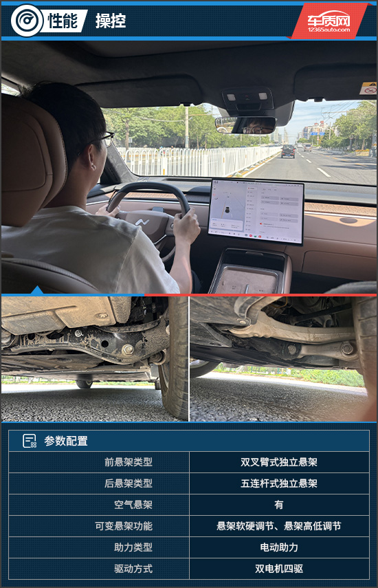 实际驾驶中,加速踏板响应灵敏且线性,在舒适模式下轻踩即可输出充沛动力,平顺不突兀,十分适合日常通勤。而在运动模式下,动力调校更为激进,深踩踏板时前后电机全力输出,推背感强烈,即便评测车的整备质量已超过2.3t,但其动力储备依旧令驾驶员充满信心。