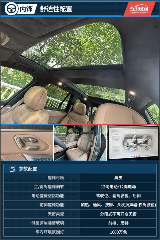 舒适配置方面,评测车配备分段式不可开启天窗及物理遮阳帘,可有效阻挡烈日直晒。座椅采用13层复合结构,柔软贴合,长时间乘坐也不易疲劳。全车三排座椅均支持加热,前两排还具备通风和按摩功能,二排右侧更提供零重力模式,带来媲美头等舱的乘坐体验。此外,第二排还配备17.3英寸吸顶屏、8英寸控制屏、小桌板及8.8L的智能冰箱(0-50°温区),为乘员带来了舒适、周全的照顾。