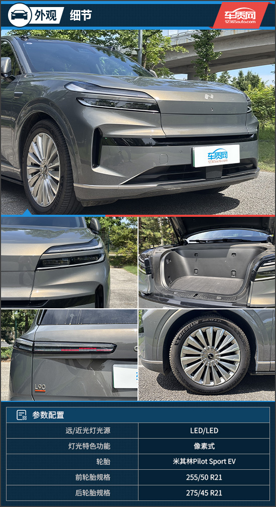 此外,评测车选装了21英寸多辐光辉轮毂,大幅增强视觉稳重感的同时,也进一步提升了整车的豪华气质。其匹配的米其林PS EV系列轮胎在静音性、能耗表现与抓地性能之间实现了良好平衡,规格分别为前255/50 R21、后275/45 R21。