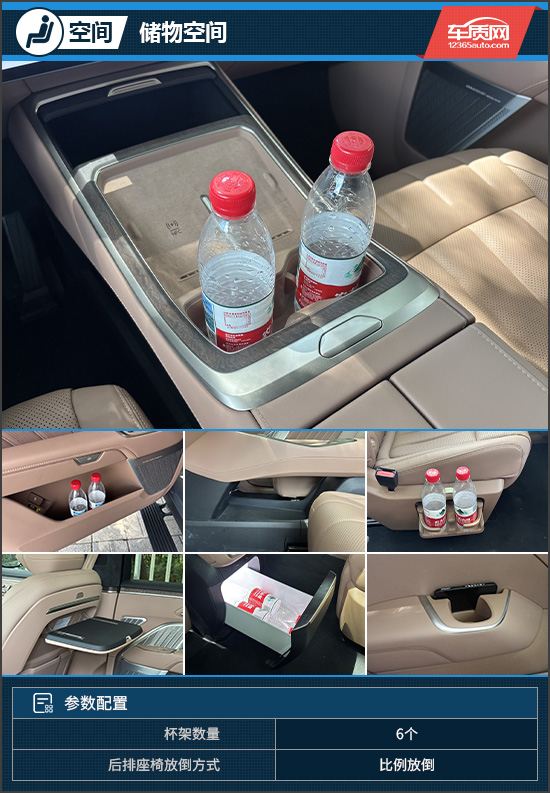 在储物空间方面,评测车表现十分出色。中控台前方配备带伸缩盖板的储物格,下方设有超大开放式储物格及12V电源接口,非常实用。第二排座椅侧方配有隐藏式杯架,第三排则不仅提供杯架,还配备了手机槽,设计细致周到。另外,车门把手采用封底设计,进一步提高了储物的灵活性。